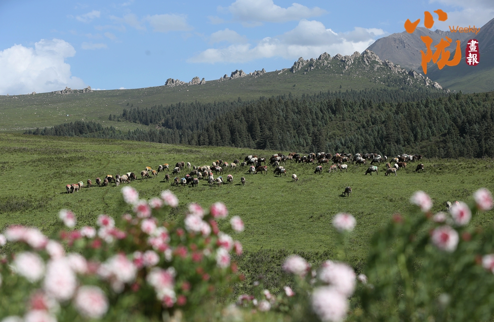在起伏的丘陵間,廣袤的草原宛如少女柔美的曲線,美得簡(jiǎn)直超出想象,綠草茵茵、繁花似錦,微風(fēng)吹過(guò),濃郁的花香撲鼻而來(lái)。那連綿的群山、蜿蜒的河流,交織成網(wǎng),將這片土地滋潤(rùn)成生命的綠洲。