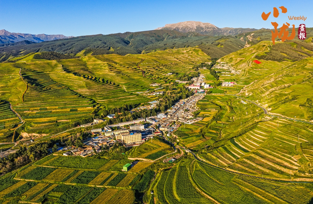 溝壑縱橫,滿目生綠。廣袤的田野在陽光下盡情綻放著大自然的絢麗多彩,熱烈地期盼著新季節(jié)的到來;羊群如散落的云朵,在坡地間緩緩移動,盡享這份寧靜與和諧。