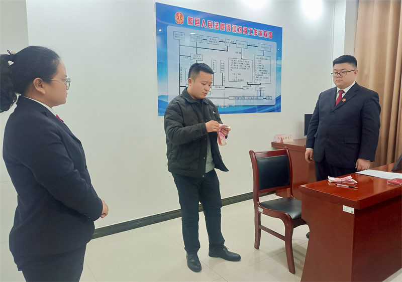 “你看我們也在幫你執(zhí)行,還有最后的1.5萬元,你執(zhí)行清楚自己也輕松。”徽縣人民法院賈利輝給被執(zhí)行人朱某做工作,要求他配合執(zhí)行。