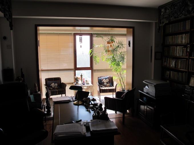 書桌上擺著臺燈、筆筒,以及他喜歡的各類藝術(shù)品。氣晴好時,逆向照進來的陽光會把這一切都變成“剪影”,很美。