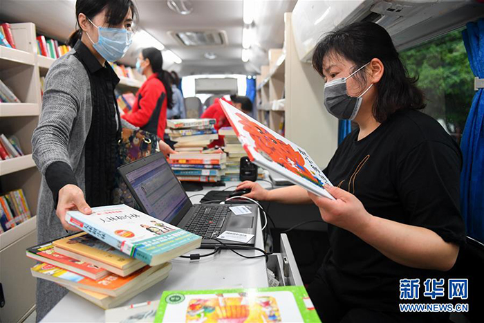 3月26日,在長沙岳麓區(qū)石嶺塘社區(qū),家長和小朋友在流動圖書館里挑選書籍。 近日,在做好疫情防控工作的同時,長沙流動圖書館恢復運營。長沙流動圖書館是長沙圖書館的總分館流動服務項目之一,以大巴車為載體,每月定期到社區(qū)、學校、企業(yè)、工地等區(qū)域,為市民提供閱覽、咨詢、辦證、借書、還書等便捷化公共服務。 新華社記者 陳澤國 攝
