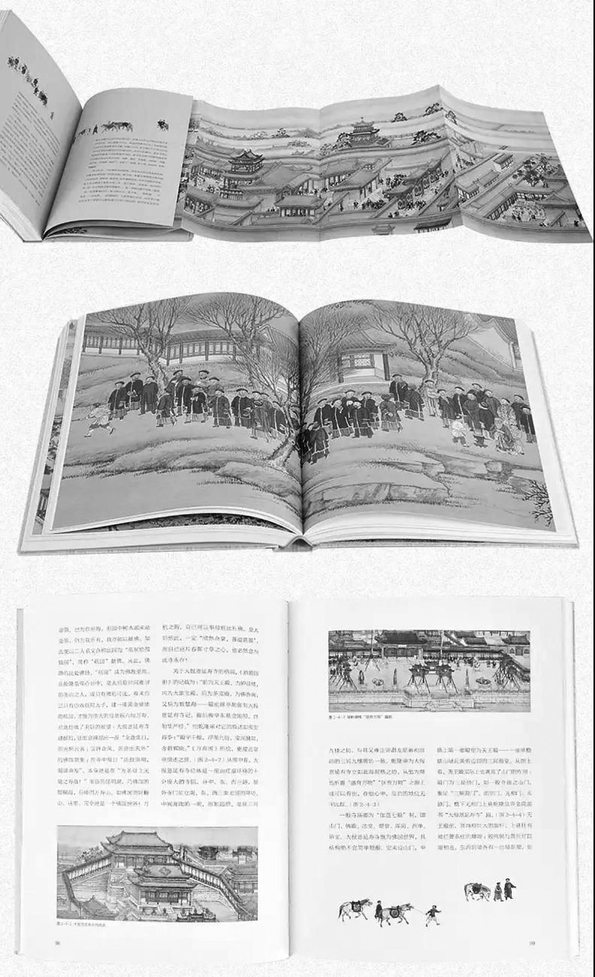 二是“小史”大全,考訂謹(jǐn)嚴(yán)。全書以崇圖的圖像為中心,按圖索“驥”,稽古鉤沉,發(fā)微抉隱,形成涉獵廣泛、內(nèi)容豐瞻的數(shù)十個(gè)小史。其中題材宏觀一些的有北京城垣史、京城水利史和清代鹵簿儀仗制度、禁衛(wèi)制度、清代音樂(lè)戲曲、清代服飾沿革等,題材具體一些的有昆明湖、大報(bào)恩延壽寺、壽安宮、紫竹院、武英殿、內(nèi)務(wù)府、西洋元素、京城商鋪等,乃至更為具體的石舫、望蟾閣、冰床、餑餑點(diǎn)心等的歷史。這些小史與一般史話的區(qū)別在于學(xué)術(shù)上的嚴(yán)謹(jǐn)考訂、精美圖片的實(shí)證和文字表述的精粹。