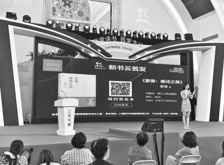 2020上海書(shū)展首次啟用了新書(shū)“云首發(fā)”的形式。8月15日,在《蒙曼:唐詩(shī)之美》新書(shū)“云首發(fā)”現(xiàn)場(chǎng),讀者可以掃描大屏幕上的二維碼進(jìn)行圖書(shū)購(gòu)買(mǎi)。