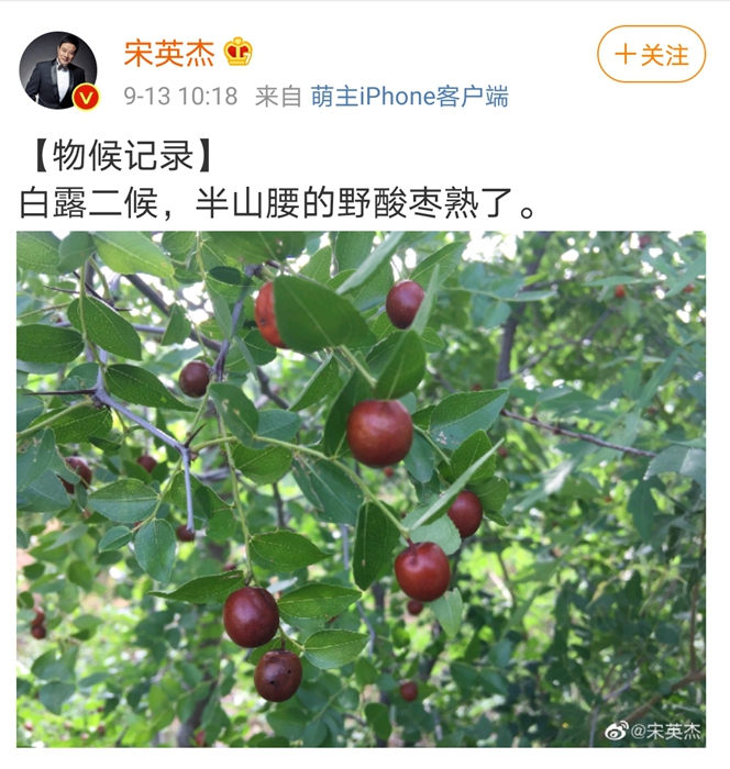 如今,他仍然會隨手在社交媒體上記錄四時(shí)風(fēng)物的變化,前幾天發(fā)了一張照片,配文“白露二候,半山腰的野酸棗熟了。”對他而言,隨時(shí)關(guān)注氣候與物候,已經(jīng)成為一種習(xí)慣。(完)