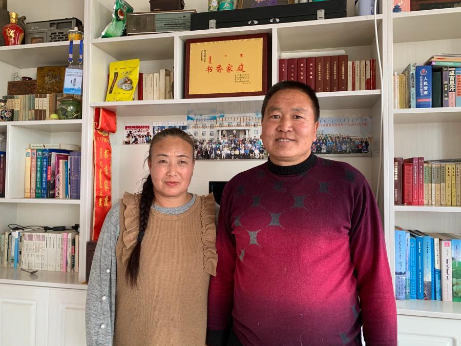 2020年12月10日,牧民敖特根達(dá)來(lái)和妻子在自家“書香家庭”獎(jiǎng)牌前合影。新華社記者 朱文哲 攝
