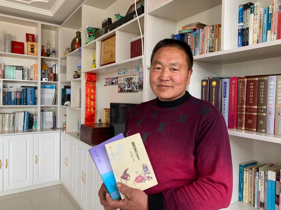 “高中畢業(yè)后我回鄉(xiāng)放牧,起初想看書也找不到書,后來(lái)外出打工才讀到更多的書,收藏的書也多了。”提及往事,孟克達(dá)來(lái)仍記憶猶新,“文學(xué)書、歷史書、工具書,我全都愛讀。”