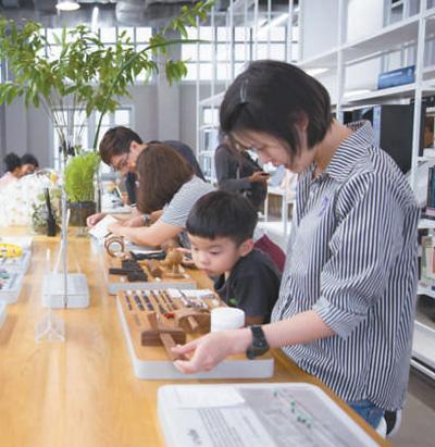 在泰國創(chuàng)意與設(shè)計(jì)中心圖書館,來訪者正在位于二層的材料體驗(yàn)區(qū)參觀。泰國創(chuàng)意與設(shè)計(jì)中心圖書館供圖