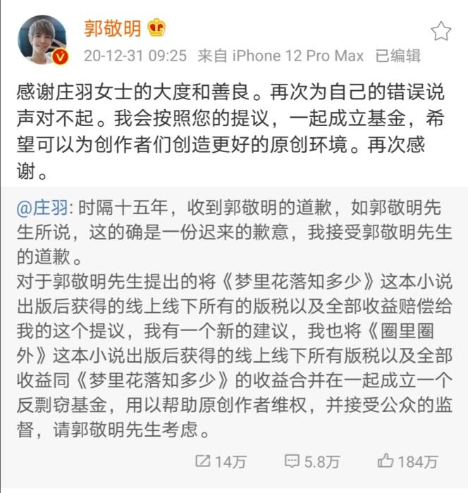 2020年12月31日,郭敬明通過微博就其小說《夢里花落知多少》抄襲莊羽小說《圈里圈外》一事道歉:“時間過去了十五年,這個錯誤一直伴隨著我,從我年少,到青年,到如今馬上走向四十歲的人生中點。”