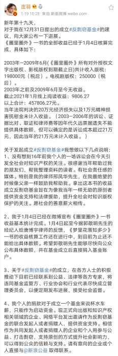 2021年1月19日,莊羽公布了“反剽竊基金”的最新進展:《圈里圈外》一書的全部收益已經于1月4日核算完成。