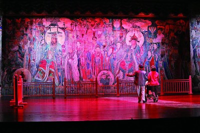 《永樂宮紀事》創(chuàng)造性地將蒲劇、歌劇、舞劇、話劇、音樂劇等多種藝術形式有機結合、融為一體,在充分利用地域文化元素的同時,還將珍貴的永樂宮壁畫與現(xiàn)代聲光電等舞臺技術有機結合,營造出絢麗多彩的舞臺效果。