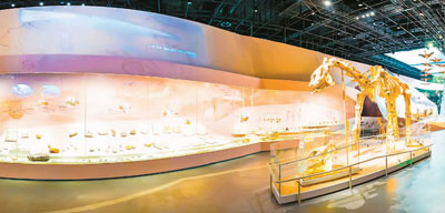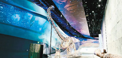 武漢自然博物館展示的中加馬門溪龍化石、硅化木和“龍”足跡化石墻。 本文圖片均由長江文明館(武漢自然博物館)提供