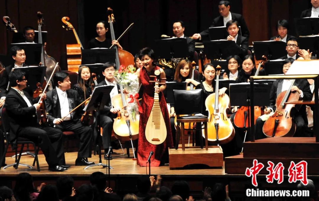 2009年2月,“琵琶皇后”美譽的章紅艷在美國肯尼迪藝術中心演奏《琵琶協(xié)奏曲》后謝幕。中新社記者 邱江波 攝