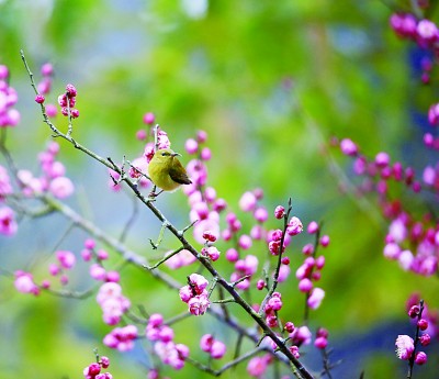 湖南省龍山縣,花兒開放,引來(lái)小鳥“鬧春戲花”。新華社發(fā)