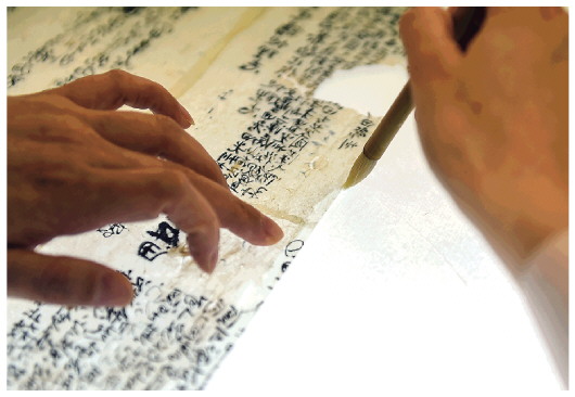▲5月17日,在安徽博物院文物科技保護(hù)中心紙質(zhì)文物修復(fù)室,工作人員對古籍文物進(jìn)行補(bǔ)全。新華社記者周牧攝