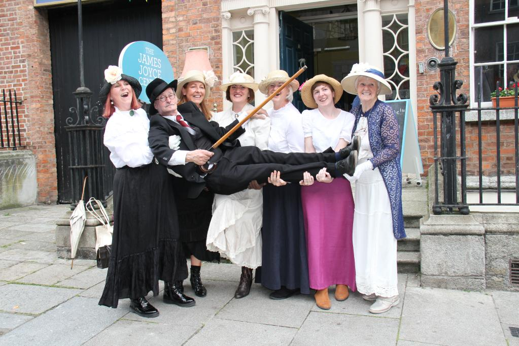 6月16日,在愛爾蘭首都都柏林,人們?cè)谡材匪?middot;喬伊斯中心前合影。