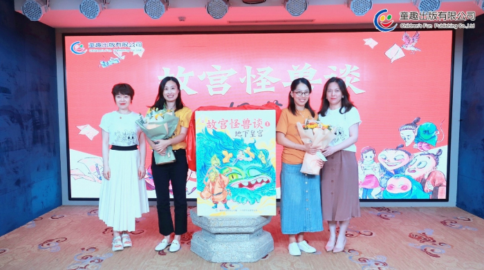 童趣出版有限公司總經(jīng)理史妍(左一)、作者常怡(左二)、插畫作者譚諾(左三)、童趣出版有限公司總編輯劉玉一(右一)為《故宮怪獸談》揭幕。