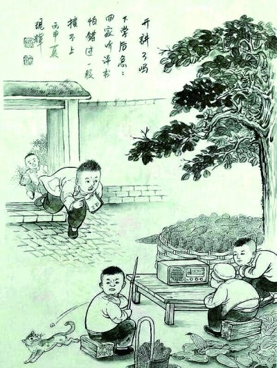 劉現(xiàn)輝的一套四冊繪畫作品《童年那些事兒》(花山文藝出版社出版),就是一次目光穿越時光阻隔,對童年和故鄉(xiāng)的深情佇望。經(jīng)由長久而專注的凝視,一縷縷游絲般輕淡的鄉(xiāng)思,逐漸擴展匯聚成一種濃郁的故土深情,仿佛滿天云錦,在靈魂的天空閃現(xiàn)著動人的光華。