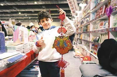 2022年開(kāi)羅國(guó)際書(shū)展上,一個(gè)男孩在中國(guó)圖書(shū)展位展示春節(jié)裝飾。