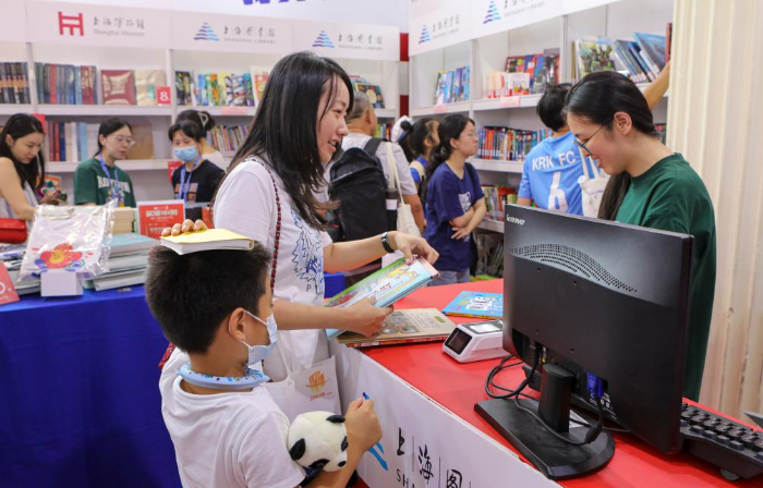 8月16日,讀者在上海圖書館展位現(xiàn)場(chǎng)借閱書籍。