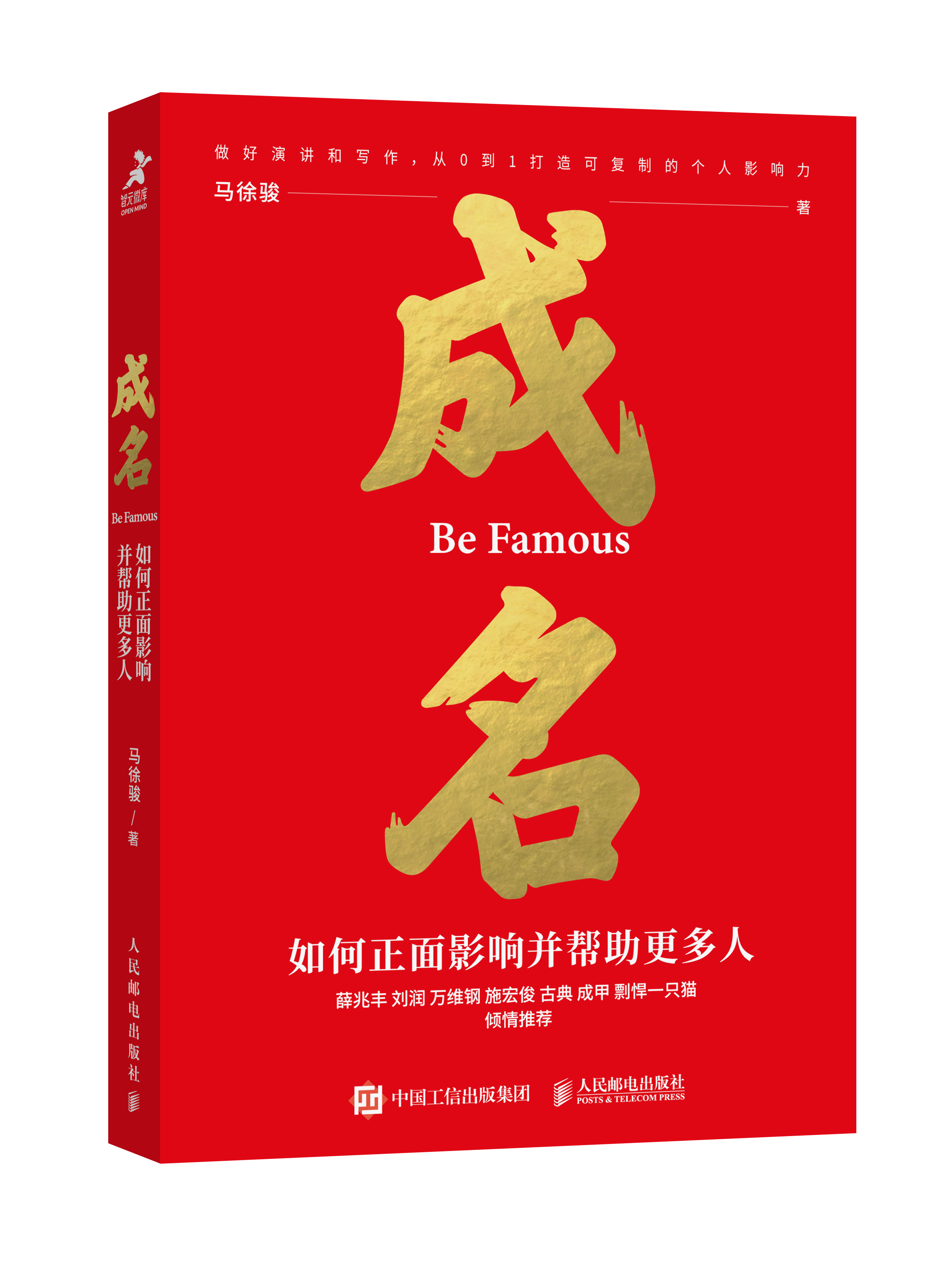 《成名》是一本看得懂、學(xué)得會、用得上的個人影響力打造手冊,展示了馬徐駿對打造好演講、寫出好文章的心得和路徑,有助于提升個人及團(tuán)隊(duì)內(nèi)容造詣,通過演講、寫作放大聲量,正確借助名望正面影響并幫助更多人。