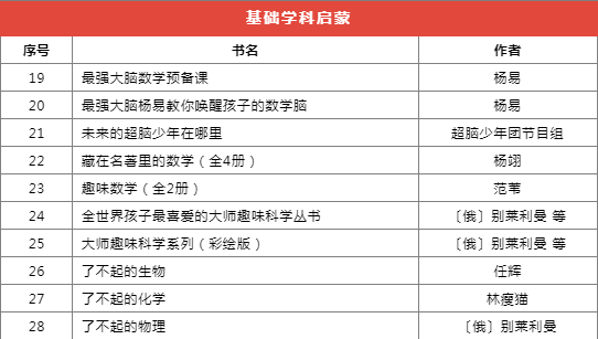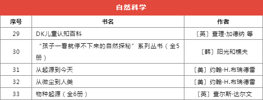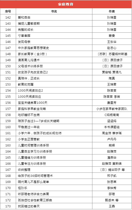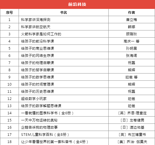 推薦書(shū)目種類(lèi)繁多,分為前沿科技、基礎(chǔ)學(xué)科啟蒙、自然科學(xué)、家庭教育等十個(gè)類(lèi)別,共計(jì)173本(套)。