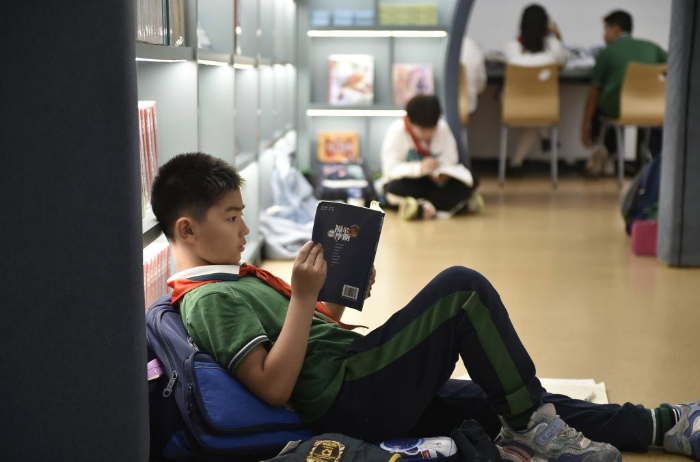 10月18日,一名小學(xué)生在鄭州市緯五路第一小學(xué)校園閱讀中心內(nèi)閱讀。