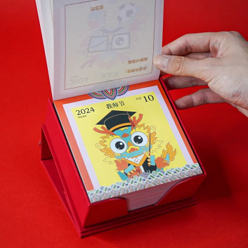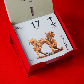 如意取出第一層里紅紅的燙金書刊盒,馬上發(fā)現(xiàn)了它的小機關(guān):原來盒蓋上有個吸鐵石,把它翻過來,就可以25度傾斜地放在書桌上,舒服地翻閱一整年的“日子”;每一天的頁面都能被絲滑地撕下,作為小書簽,插在課本讀物中。
