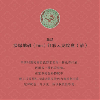 翻開新年伊始的“元旦”頁,映入眼簾的是一個綠色的盤子,上面有三條雄勁矯健的“龍爺爺”,它們來自清代吧!如意輕輕撕下日歷頁翻到反面,讀起文物小故事:“我是淡綠地礬(fán)紅彩云龍紋盤……”