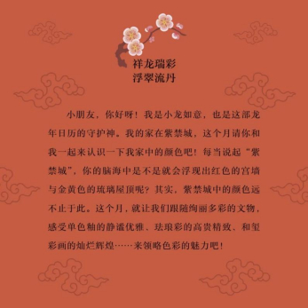 媽媽告訴如意,這是一個“時光寶盒”,里面有來自故宮不同領(lǐng)域的10位專家從故宮館藏中精選的262件“龍”文物,它們每天登場介紹自己的故事,還會請小讀者幫忙,每日動手給日歷中的小龍如意卷軸貼出一身漂亮的龍鱗。