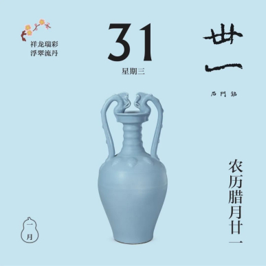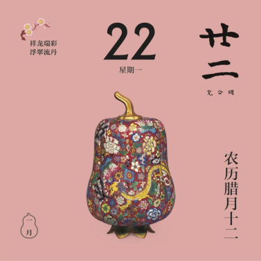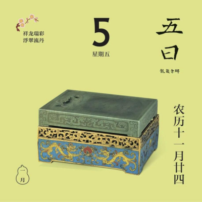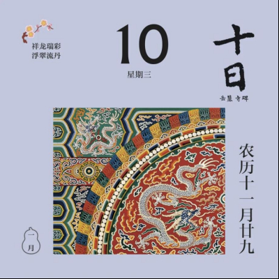 翻開1月月份頁,首先跳入眼簾的,是主題詞“祥龍瑞彩”。這個月以絢麗的顏色為主線,串起各色龍文物,比如精致的宋代單色釉龍紋盤,絢麗的故宮官式建筑和璽彩畫,還有優(yōu)雅的清代掐絲琺瑯游龍花卉紋瓜式蓋罐……