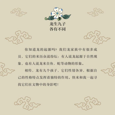 從2月到12月,如意更發(fā)現(xiàn)了“龍生九子”的故事,原來,在鐘鈕上的龍子叫“蒲牢”,在宮門上的龍子叫“椒圖”……在古老的龍家族中,有把身子彎成S形的螭龍,有在空中振翅飛舞的應(yīng)龍,還有拱起身子趴在壺上的蟠龍……精選的故宮官式建筑上的和璽彩畫、大氣精美的九龍壁和千龍吐水的螭首奇觀,都讓如意著迷而向往。