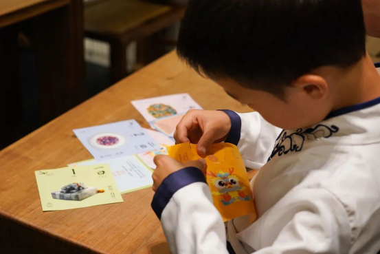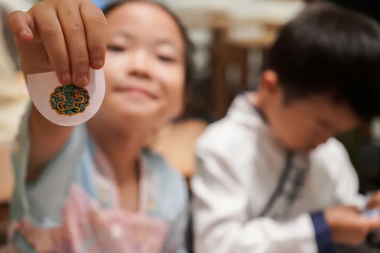 每個龍文物故事上方,也印有當天文物的小圖,它周圍伴有一圈半圓打孔的攏線。如意用小手沿著攏線輕輕一摳,一片小小的“龍鱗”就落在了手心。原來,它就是今天的“成長值”啊。
