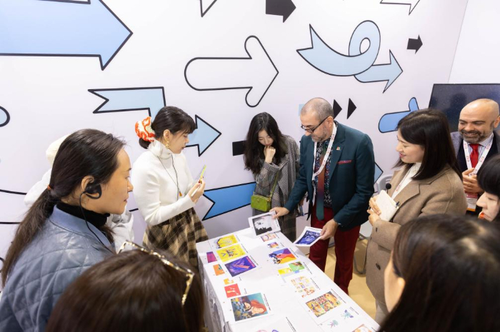 11月17日,藝術(shù)家蔡皋(右一)在第十屆中國(guó)上海國(guó)際童書展現(xiàn)場(chǎng)與書迷交流。