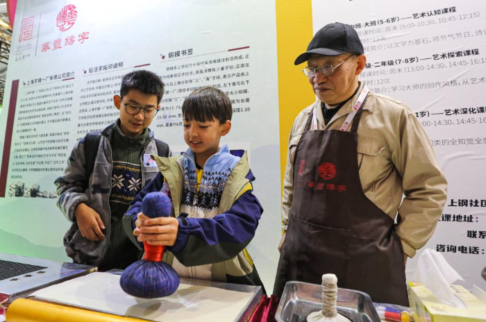 11月17日,參觀者在第十屆中國(guó)上海國(guó)際童書展現(xiàn)場(chǎng)體驗(yàn)活字印刷。