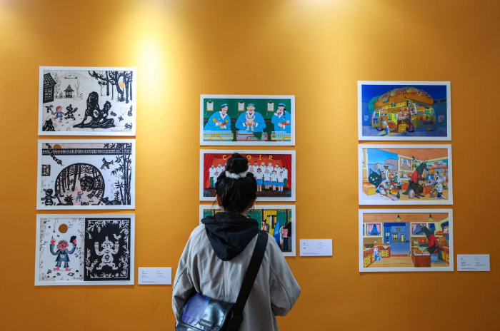 11月17日,參觀者在第十屆中國(guó)上海國(guó)際童書展現(xiàn)場(chǎng)觀看“2023金風(fēng)車國(guó)際青年插畫家大賽”參賽作品。