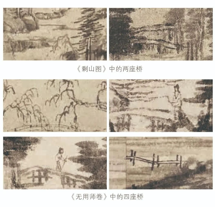 《富春山居圖》全卷共畫有六座橋,其中《剩山圖》上有兩座橋,《無(wú)用師卷》上有四座橋。讓我們先找到其中的一座橋,它在梁詩(shī)正書(shū)寫的“鑒定”開(kāi)頭部分正下方。你有沒(méi)有發(fā)覺(jué),這座橋最為特殊。