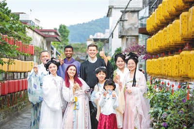 中外游客在三溪村參與沉浸式劇本游后合影留念。梁景俊攝