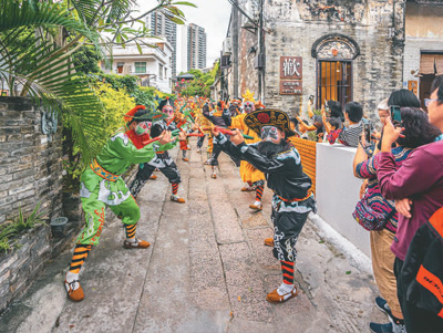 2023年11月12日,第八屆嶺南民俗文化節(jié)下基層演出在三溪舉行。圖為來自廣東普寧的英歌舞展演,引來群眾不斷喝彩。鄭建邦攝