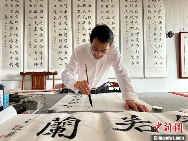 當(dāng)日,中新網(wǎng)記者跟隨通渭詩會采訪團走進通渭悅心國際書畫村。“我們這里重視寫字是刻在骨子里的,書法特長班比重遠高于音樂舞蹈等,而且從小學(xué)至高中每周有兩節(jié)書法課程。”工作人員冉盼盼說,由于祖輩傳承,書法在通渭不衰反盛,當(dāng)?shù)匾呀?jīng)形成了書畫裝裱、文房四寶銷售等完整產(chǎn)業(yè)鏈。
