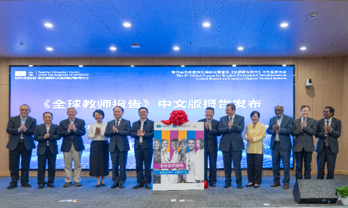 圖為與會(huì)嘉賓聯(lián)合發(fā)布首份《全球教師報(bào)告》中文版。新華網(wǎng)發(fā)