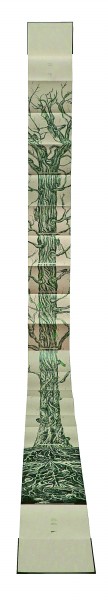 除了材料語言的拓展,展覽中的許多作品還展現(xiàn)出設計形式的創(chuàng)新與突破。如陳潔瑩的《蟬鳴樹語》聚焦了蟬絢爛而短暫的生命軌跡。書籍的裝幀方式采用經(jīng)折裝,當書本徐徐展開,一棵參天古樹好似拔地而起,貫通全書首尾。由樹根處為起點向上閱讀直至樹冠,可見蟬從卵枝到若蟲,再經(jīng)歷脫殼變?yōu)槌上x的歷程。經(jīng)由巧妙的形式設計,生命的輪回在書頁間流轉,詮釋出動人的自然之力。