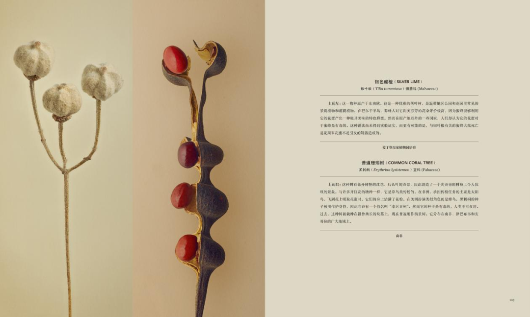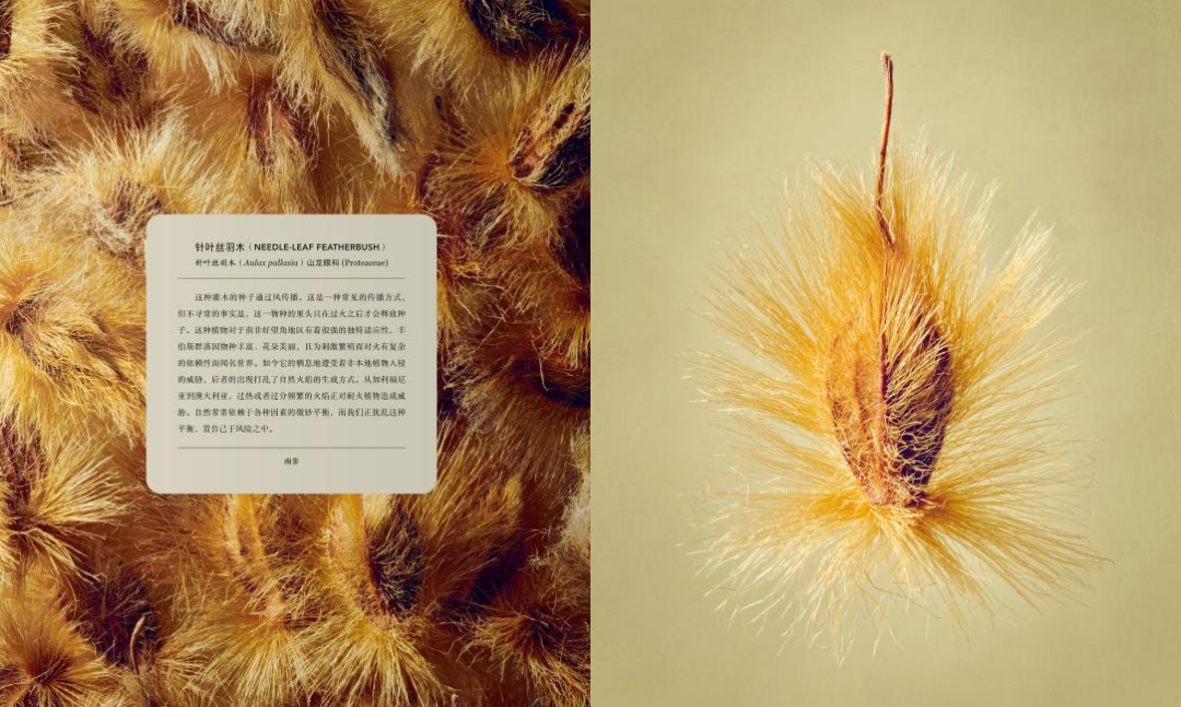 隨后,植物園耗時(shí)6個(gè)月,從3500份標(biāo)本中精心篩選出100種植物果實(shí)與種子。列文·比斯將這些攝影對(duì)象放大至80倍,捕捉到植物表面豐富多樣的細(xì)節(jié),照片的精細(xì)程度超乎想象。每張圖片還配有一段簡(jiǎn)潔的科普文字,不僅反映了100多年來植物的采集狀況,展示了種子的傳播方式,還介紹了人類對(duì)植物材料的利用方法。