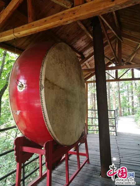 不知是何等神力相助,我竟然氣不急喘,腿不灌鉛,一口氣沖到了大鐘處。在一處長約兩百米,寬約五六米的突兀石崖下,竟然有一條長百米寬約三米的平坦棧道,直抵懸崖石壁,仿佛一條地道的天街。從懸崖上吊掛下來一尊重達千斤的銅鐘,鐘邊吊一根木質鐘錘,錘身已裂開,兩頭均被撞成起毛的“絨團”,由此可知,到達此處撞鐘的勇士并非少數。我乘興上去重重地撞了九下,雄渾、恢弘的鐘聲,在峽谷上空久久地回蕩。