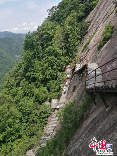 我鼓足勇氣,繼續(xù)一級一級向上攀登,一邊不斷地拍下照片。我時不時地打開手機,既怕電量不夠,更怕內存已滿。看到那些?入絕壁的龍須草、黃山松、銳齒槲櫟、映山紅……它們就像是一幅幅色彩艷麗的天然壁畫,不僅給了我美的享受,詩的靈感,更是給了我一種一往無前、奮力攀登的豪情和力量。