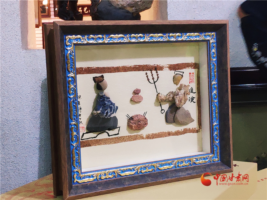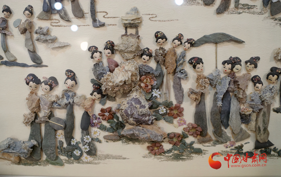 最近,周文露正在創(chuàng)作客戶定制的金陵十二釵圖,這幅風(fēng)雨雕除了人物面部經(jīng)過人為描繪加工,其他部位以及山水意境等都是戈壁沙石所做。很大程度上,這幅作品就是巧妙地將戈壁沙石創(chuàng)意堆砌達(dá)到畫面效果。