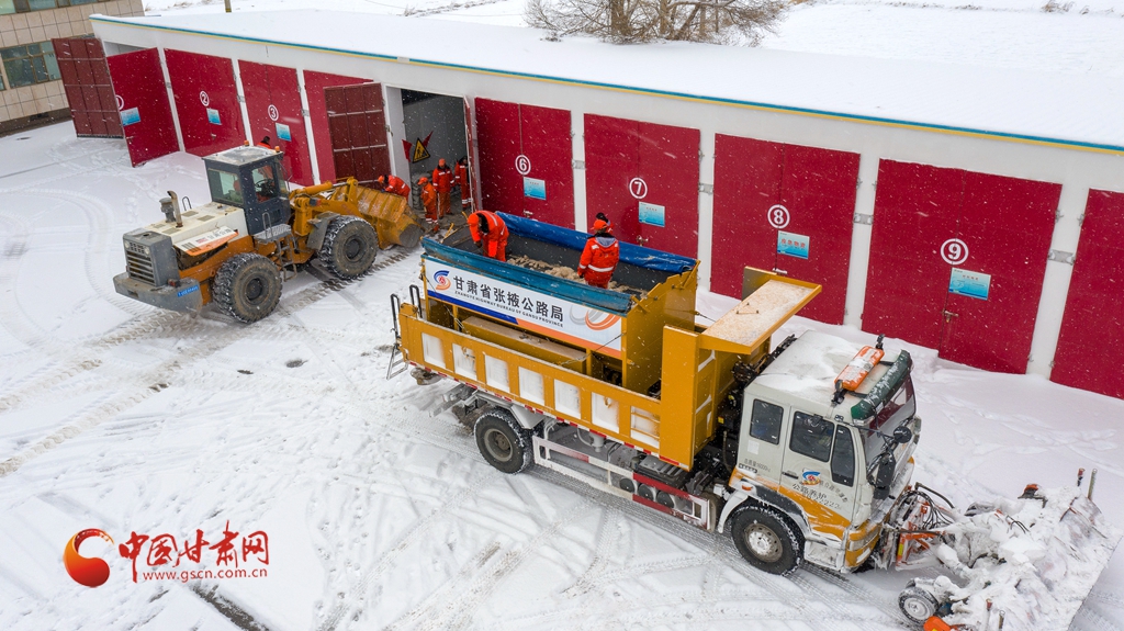 12月12日,甘肅省張掖公路局職工在裝運(yùn)融雪劑。(無人機(jī)照片)