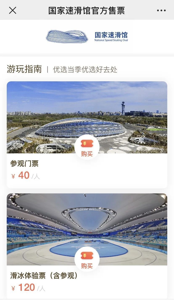 來這里參觀可以通過微信關(guān)注“國(guó)家速滑館”公眾號(hào)進(jìn)行票務(wù)預(yù)約。參觀門票40元每人次。參觀加上冰的套票120元每人次。根據(jù)游客需求,也可以現(xiàn)場(chǎng)購(gòu)買80元每人次的滑冰體驗(yàn)票,其中包含了90分鐘的滑冰體驗(yàn)和一套冰鞋一套護(hù)具。