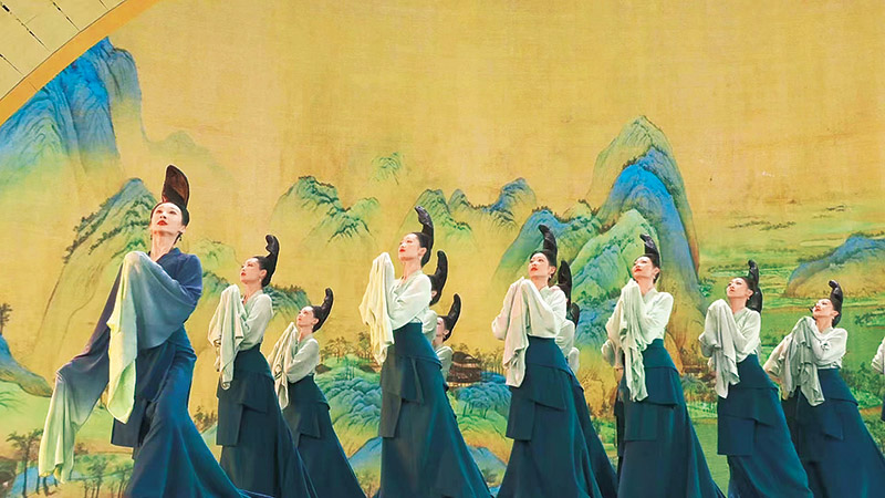 圖為圍繞傳世名作《千里江山圖》創(chuàng)排的舞蹈詩劇《只此青綠》亮相2022年中央廣播電視總臺(tái)春節(jié)聯(lián)歡晚會(huì)(視頻截圖)。 中央廣播電視總臺(tái)供圖