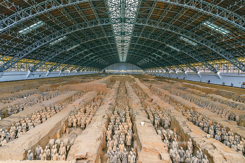 秦始皇陵是中國(guó)歷史上第一個(gè)多民族的中央集權(quán)國(guó)家的皇帝秦始皇于公元前246年至公元前208年?duì)I建的。作為秦始皇陵陪葬墓坑之一的兵馬俑坑于1974年被發(fā)現(xiàn),被譽(yù)為“世界第八大奇跡”。圖為秦始皇兵馬俑博物館一號(hào)坑全景?!∪嗣駡D片 丁俊豪/攝