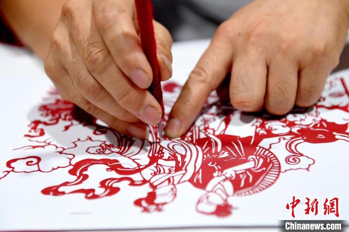 尤金水在剪刻《鵲橋相會》剪紙作品 苗鳳強(qiáng) 攝